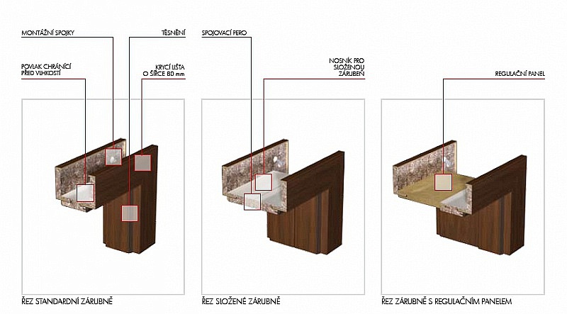 Jedenáct možností nastavení podle tloušťky zdi od 75 mm do 300 mm. Pro silnější stěny pak kombinace párování dvou zárubní až do tloušťky 600 mm.
